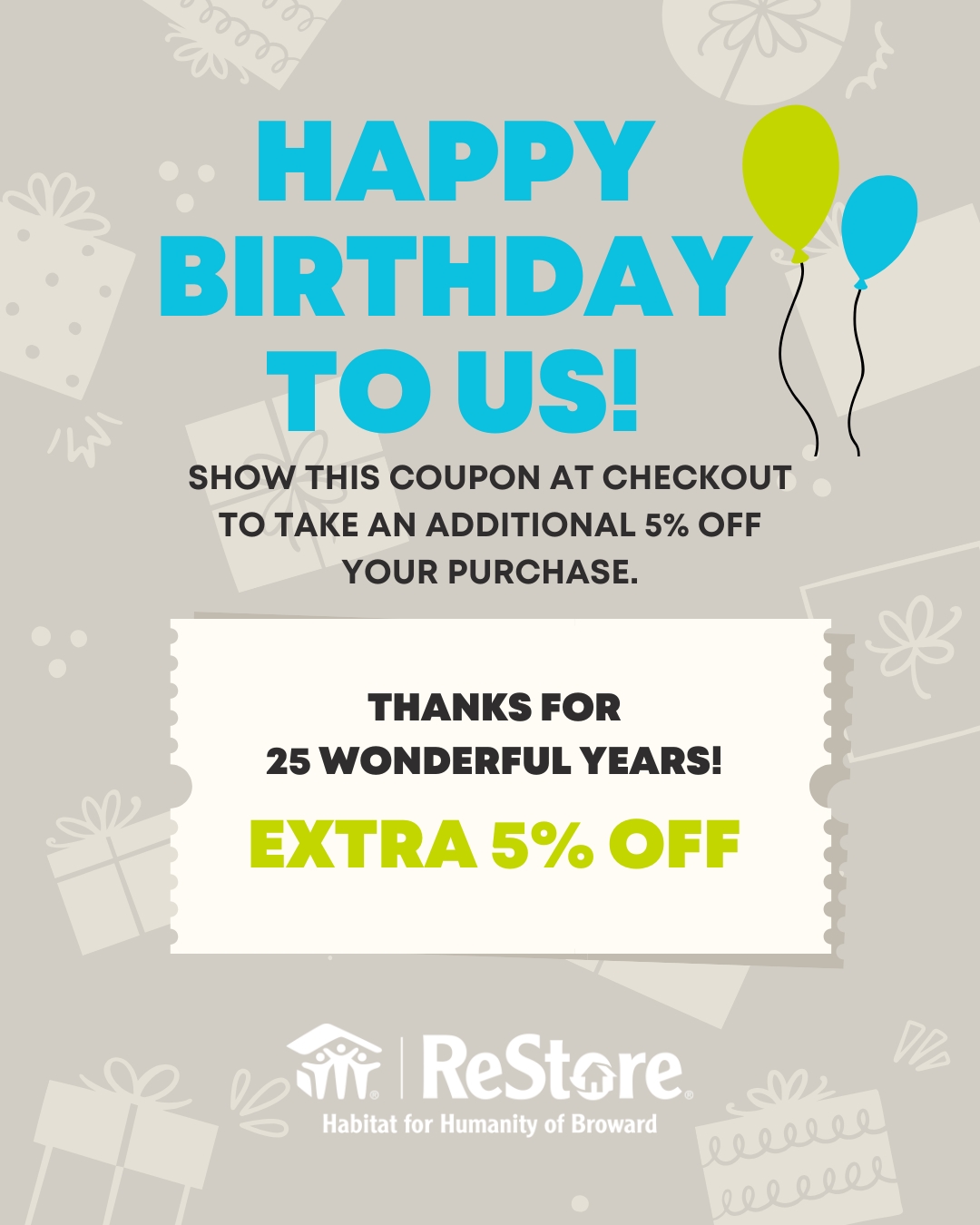 Celebrate 25 years of ReStore Broward with us and enjoy extra savings while making a difference in your community. Print or show your coupon at checkout to enjoy an extra 5% off – and be part of our next 20 years of impact!
